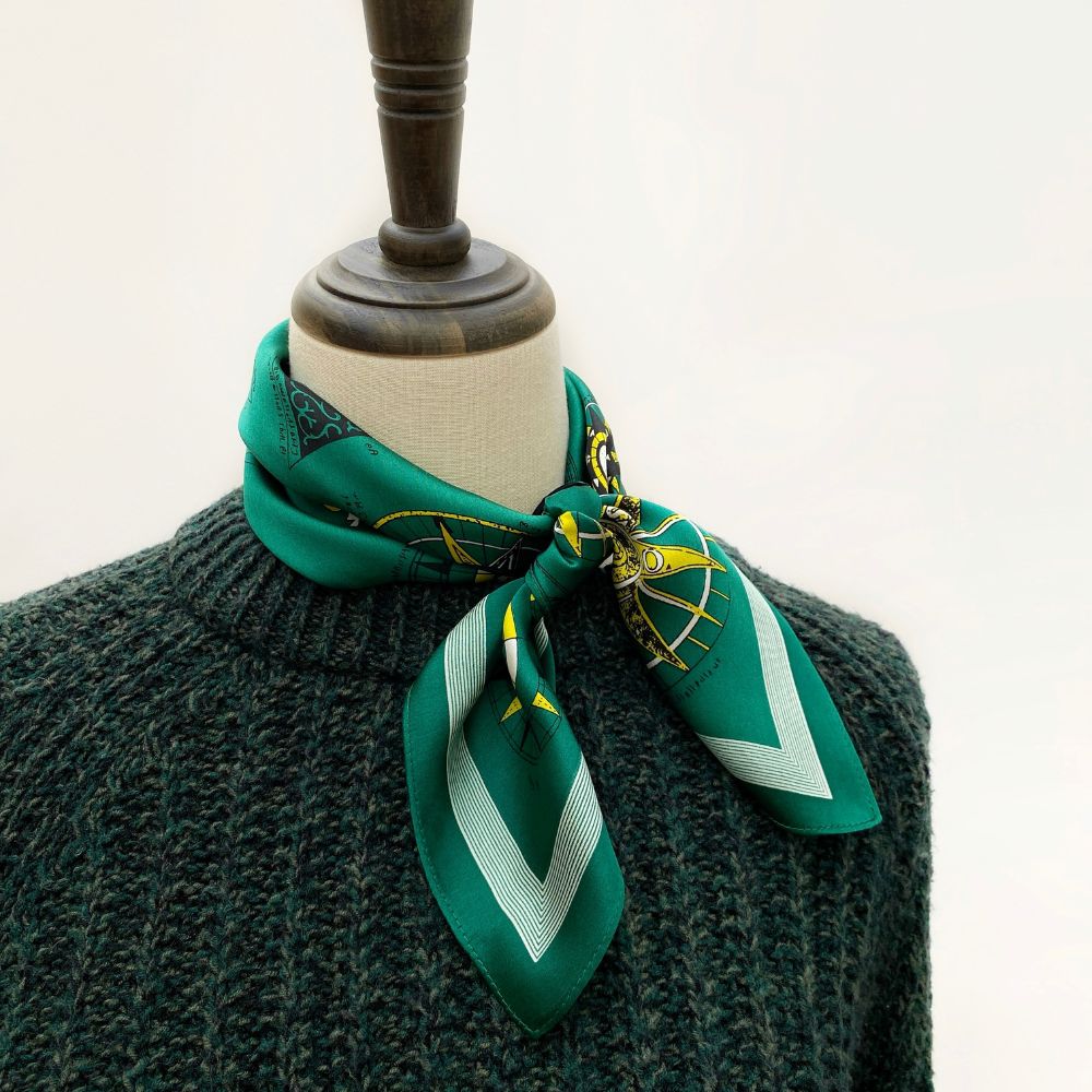The lightweight mulberry silk bandana scarf features a bold nautical theme with detailed compass designs, giving it a subtle vintage charm.