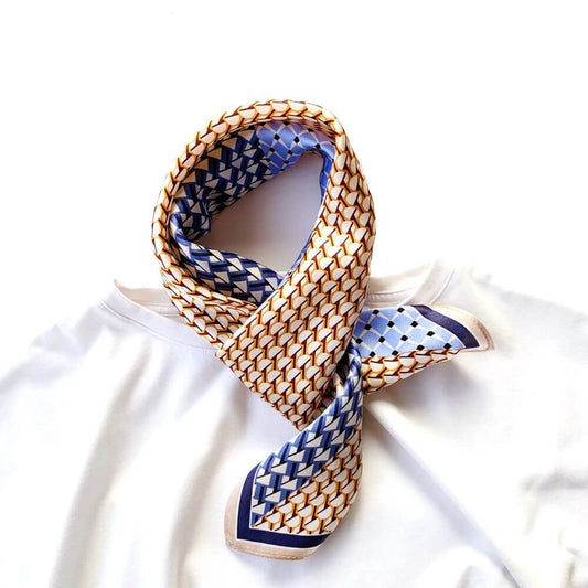 Mulberry Silk Satin Bandana - Blue & Caramel Geometric